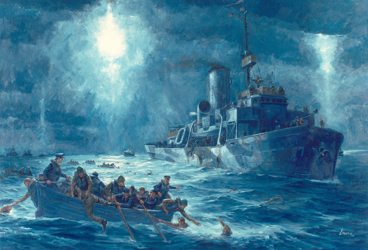 Survivors can hear different languages mixed in the prayers of the chaplains, including Jewish prayers in Hebrew and Catholic prayers in Latin. Only 230 of the 904 men aboard the ship are rescued. Life jackets offer little protection from hypothermia, which kills most men in the water. The water temperature is 34 °F and the air temperature is 36 °F. By the time additional rescue ships arrive, "hundreds of dead bodies were seen floating on the water, kept up by their life jackets."